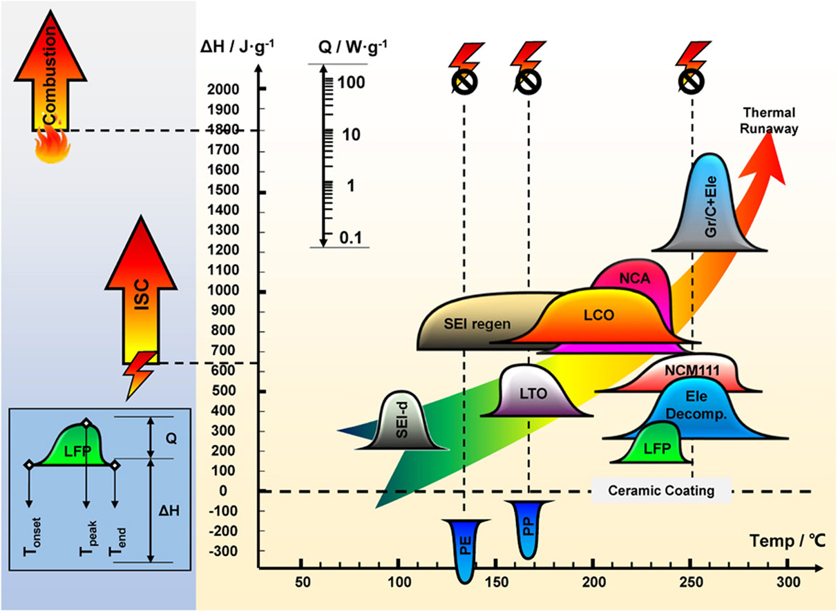 Lithium-ion power battery in the occurrence of thermal runaway is a chain of exothermic process, not instantaneous completion. As the temperature continues to rise in the following order: high temperature capacity decay - SEI film decomposition - negative electrode - electrolyte reaction - the melting process of the diaphragm - the decomposition reaction of the positive electrode - the decomposition reaction of the electrolyte solution - the reaction of the negative electrode with the adhesive --electrolyte combustion, etc.