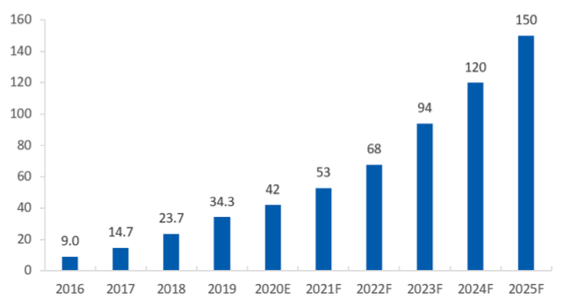 Global ternary cathode shipments and forecast, 2016-2025 (unit: 10,000 tons)
