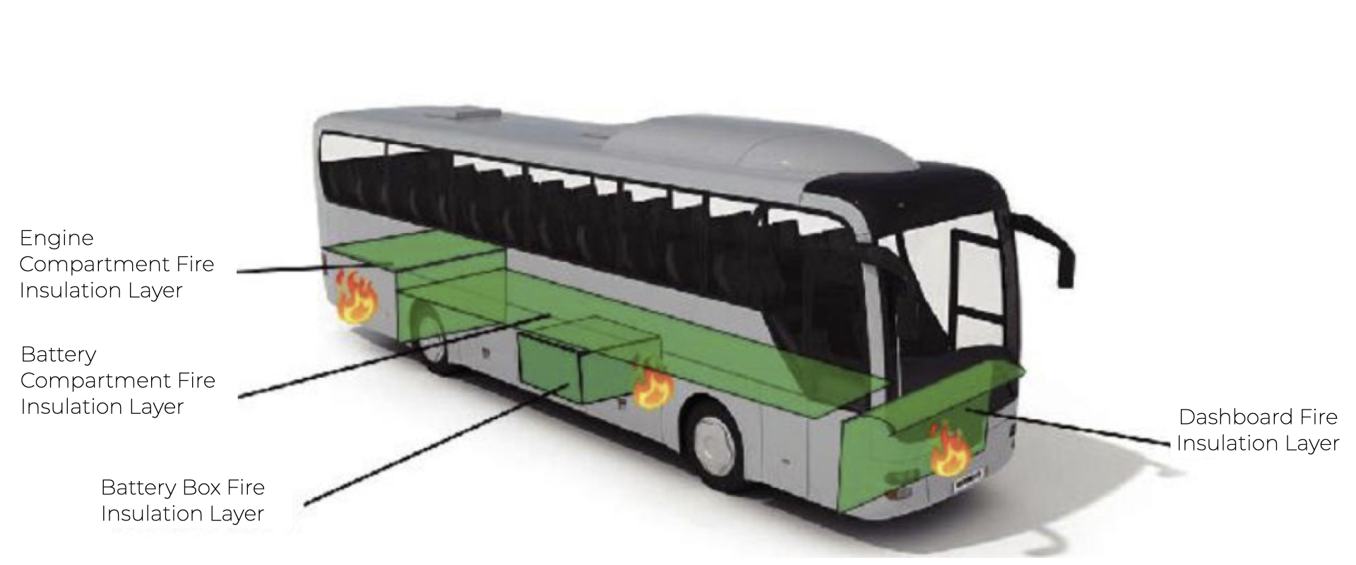 The aerogel composite material can withstand the instantaneous impact of high temperature energy caused by the short circuit of the battery pack, which can better solve the safety problem of power battery. According to the requirements of "Safety Technical Conditions of Electric Buses", the rechargeable energy storage system (or installation compartment) should be isolated from the passenger compartment by using flame retardant insulation material, the burning performance of which should meet the requirements of Class A non-combustion as stipulated in GB8624-2012, and the thermal conductivity should be less than or equal to 0.04W/(m·k) at 300 °C (572 °F). Each surface of its silica aerogel felt layer is connected by high-silica oxygen glass fiber cloth layer wrapping, and the opening of the wrapping is connected by high-silica oxygen thread.