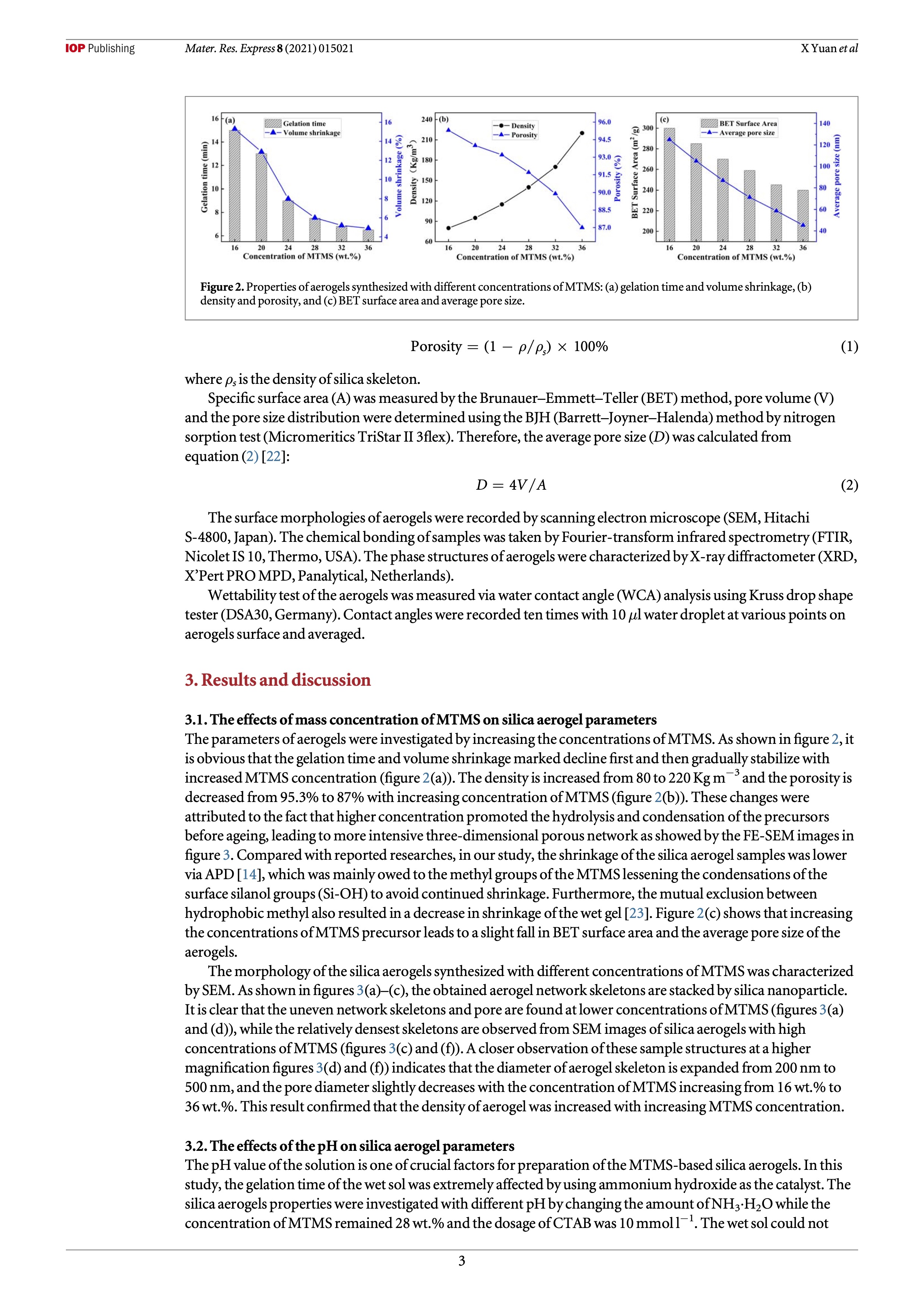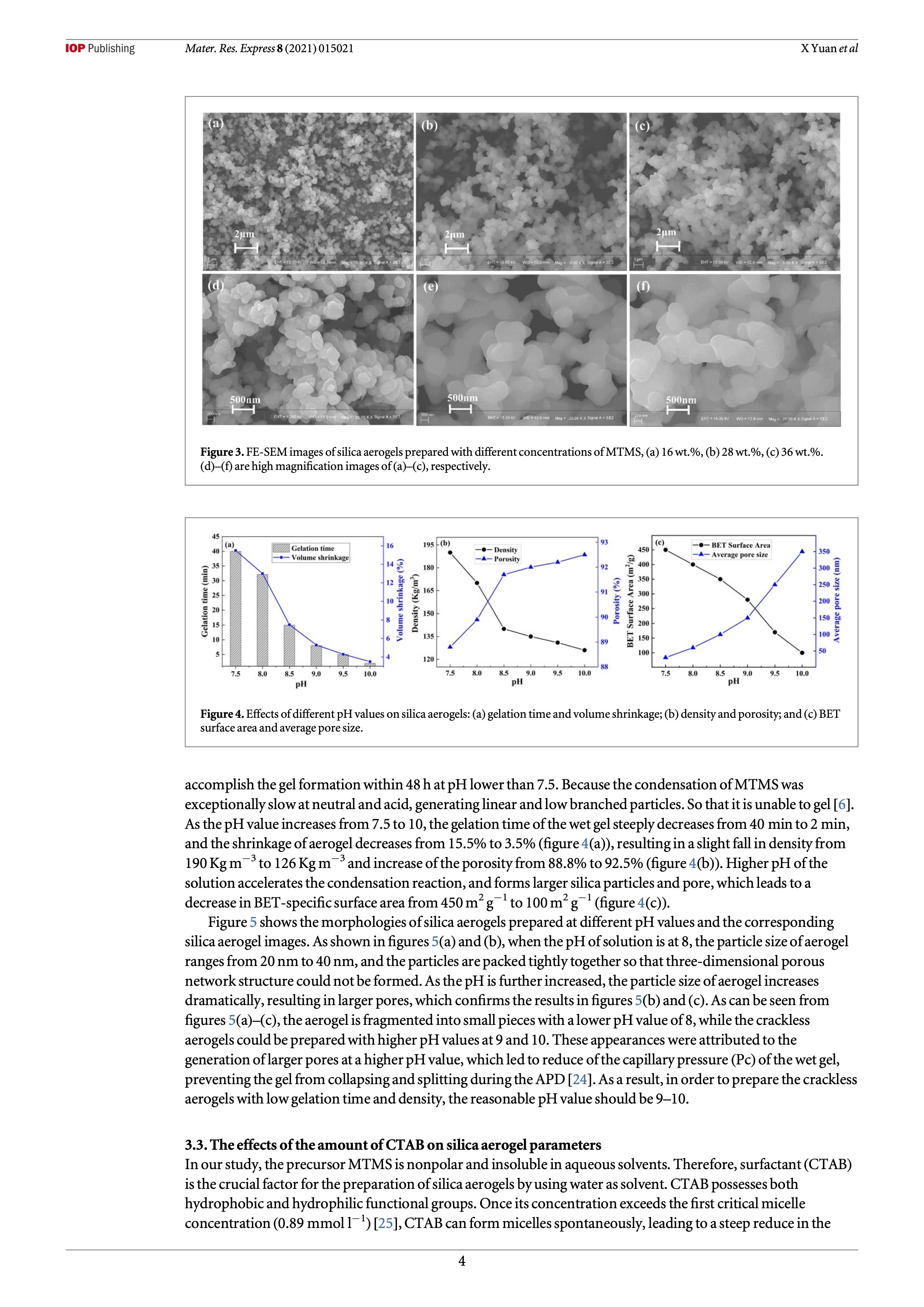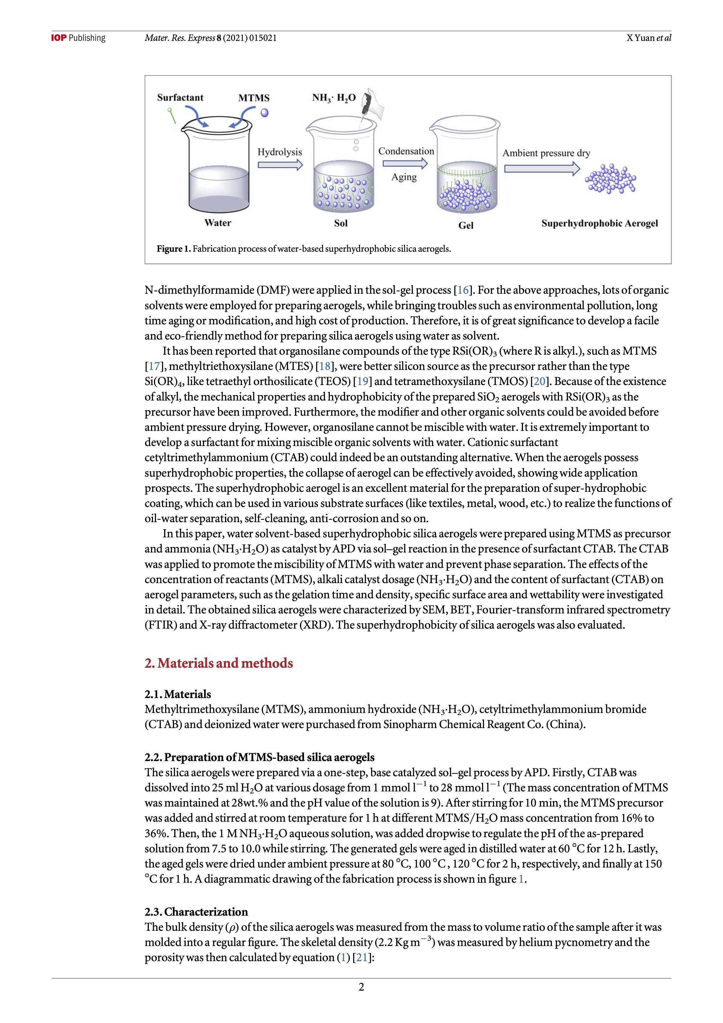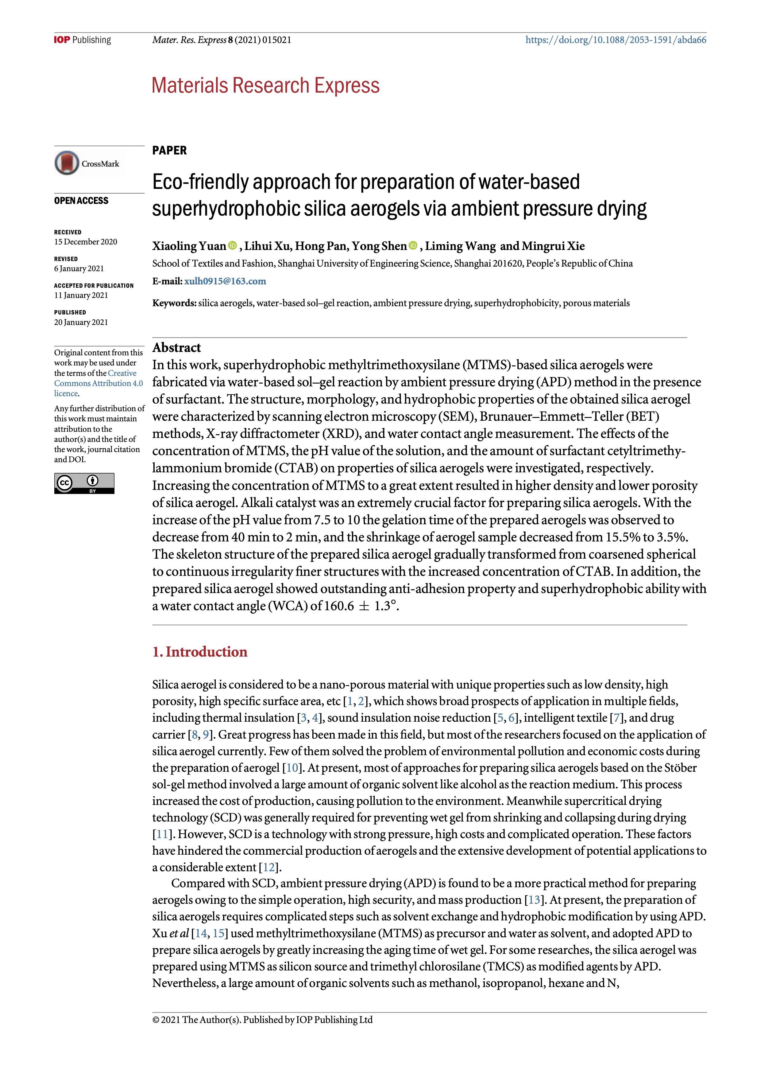 In this work, superhydrophobic methyltrimethoxysilane (MTMS)-based silica aerogels were fabricated via water-based sol–gel reaction by ambient pressure drying (APD) method in the presence of surfactant. The structure, morphology, and hydrophobic properties of the obtained silica aerogel were characterized by scanning electron microscopy (SEM), Brunauer–Emmett–Teller (BET) methods, X-ray diffractometer (XRD), and water contact angle measurement. The effects of the concentration of MTMS, the pH value of the solution, and the amount of surfactant cetyltrimethy- lammonium bromide (CTAB) on properties of silica aerogels were investigated, respectively. Increasing the concentration of MTMS to a great extent resulted in higher density and lower porosity of silica aerogel. Alkali catalyst was an extremely crucial factor for preparing silica aerogels. With the increase of the pH value from 7.5 to 10 the gelation time of the prepared aerogels was observed to decrease from 40 min to 2 min, and the shrinkage of aerogel sample decreased from 15.5% to 3.5%. The skeleton structure of the prepared silica aerogel gradually transformed from coarsened spherical to continuous irregularity !ner structures with the increased concentration of CTAB. In addition, the prepared silica aerogel showed outstanding anti-adhesion property and superhydrophobic ability with a water contact angle (WCA) of 160.6 ± 1.3°.