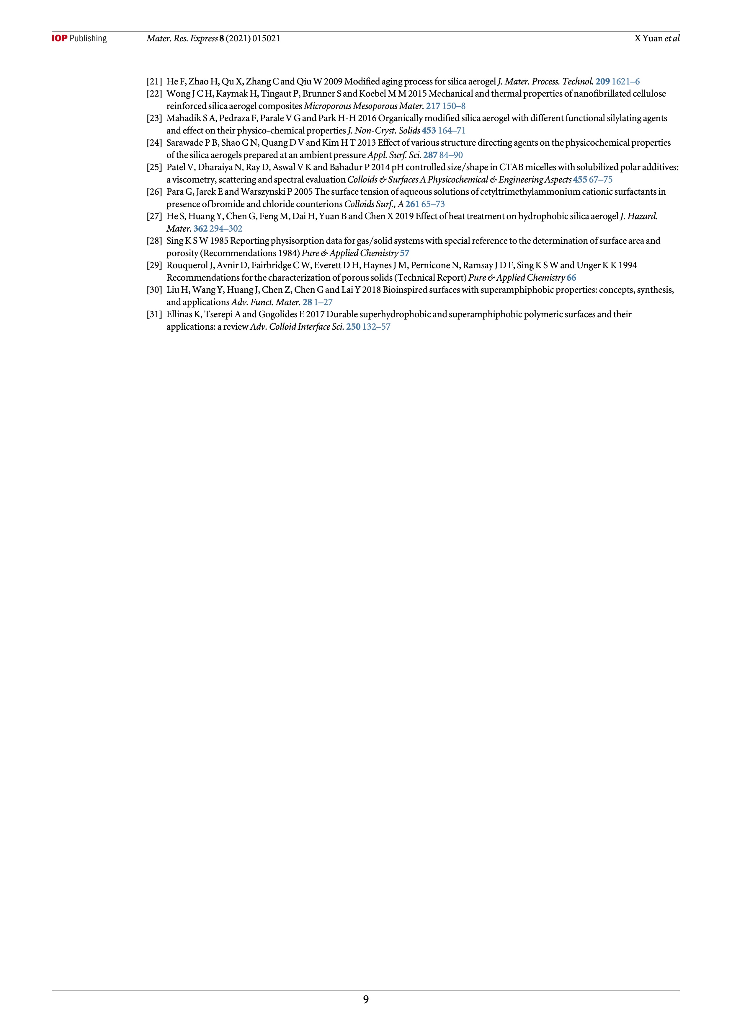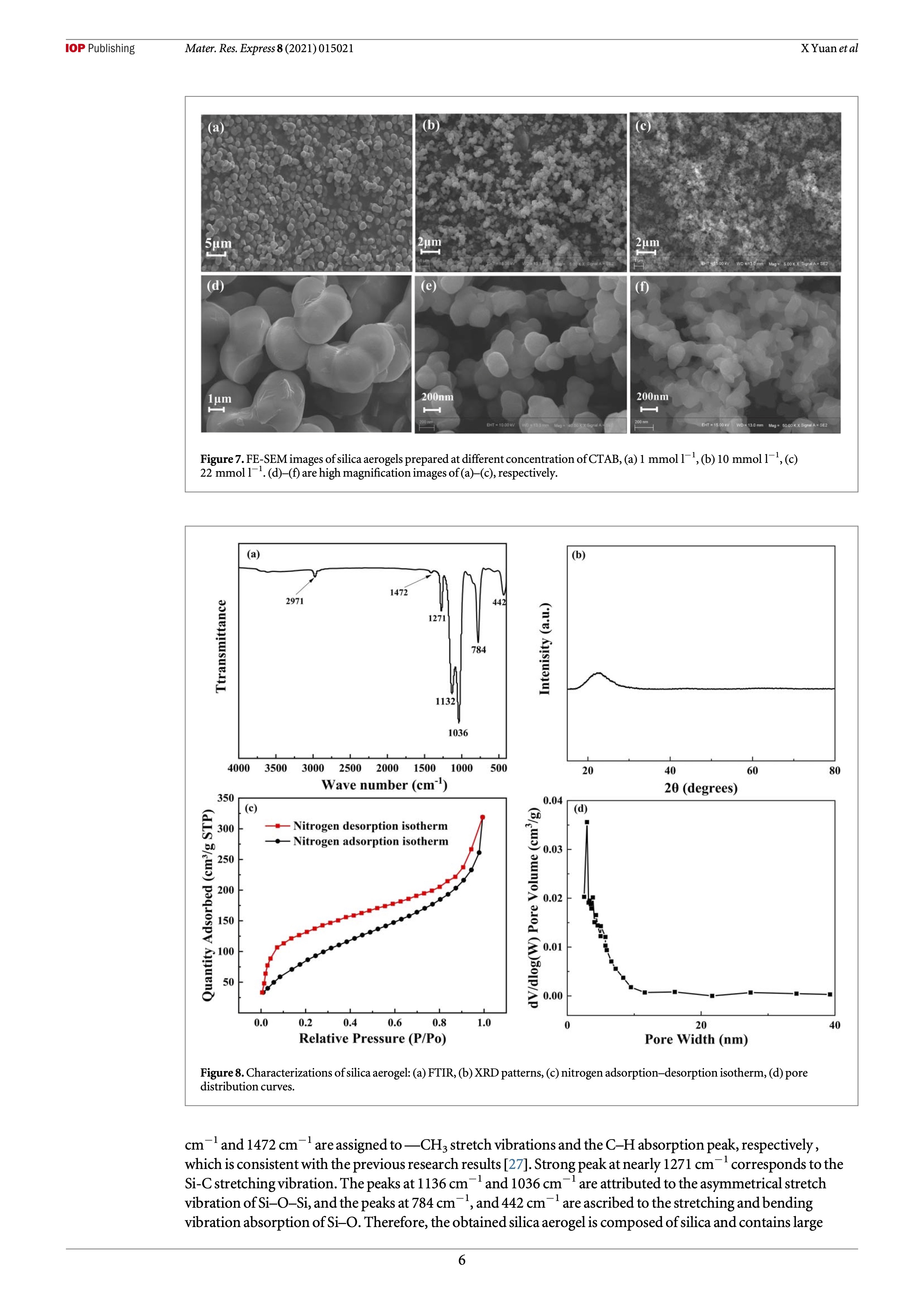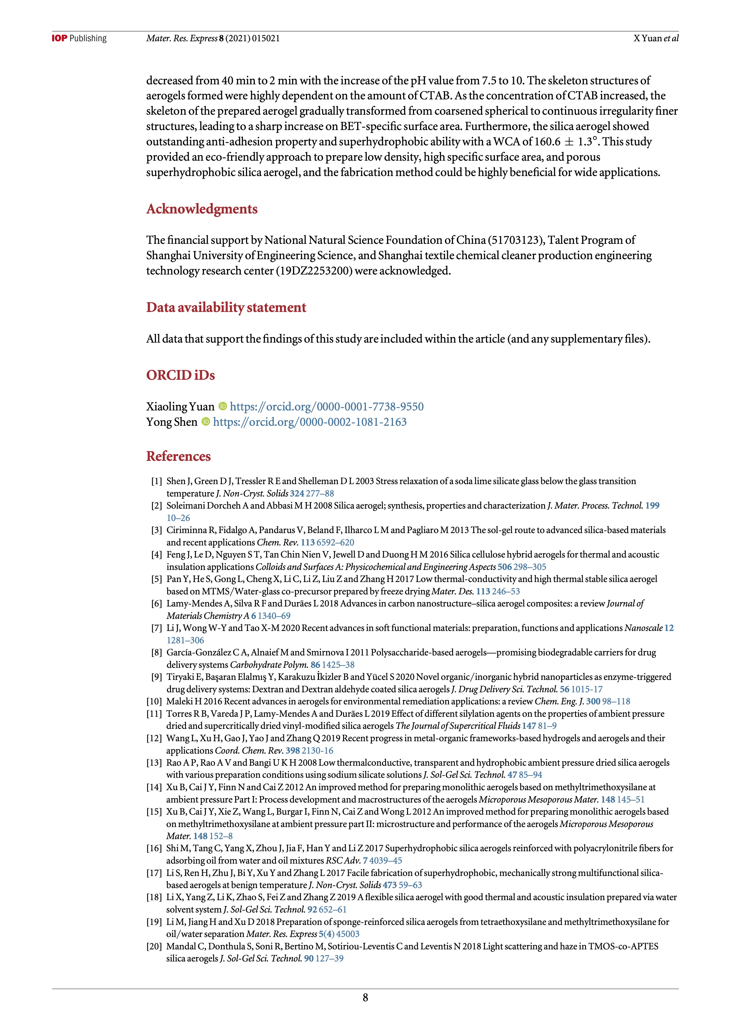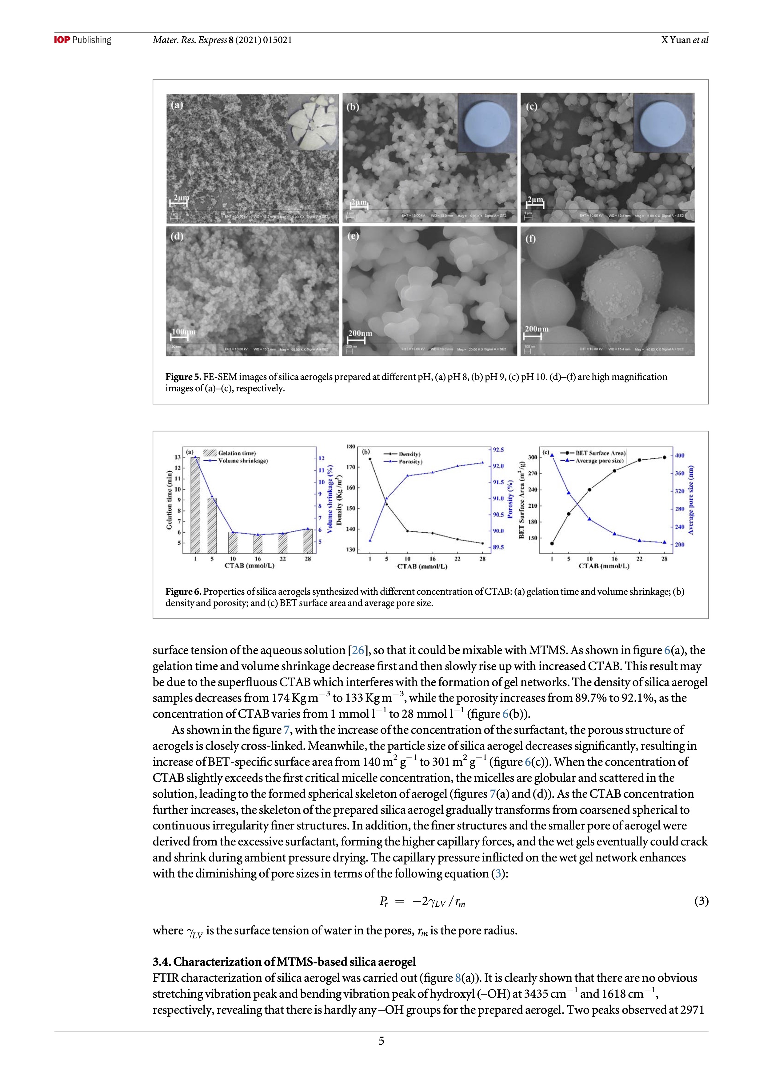 In this work, superhydrophobic methyltrimethoxysilane (MTMS)-based silica aerogels were fabricated via water-based sol–gel reaction by ambient pressure drying (APD) method in the presence of surfactant. The structure, morphology, and hydrophobic properties of the obtained silica aerogel were characterized by scanning electron microscopy (SEM), Brunauer–Emmett–Teller (BET) methods, X-ray diffractometer (XRD), and water contact angle measurement. The effects of the concentration of MTMS, the pH value of the solution, and the amount of surfactant cetyltrimethy- lammonium bromide (CTAB) on properties of silica aerogels were investigated, respectively. Increasing the concentration of MTMS to a great extent resulted in higher density and lower porosity of silica aerogel. Alkali catalyst was an extremely crucial factor for preparing silica aerogels. With the increase of the pH value from 7.5 to 10 the gelation time of the prepared aerogels was observed to decrease from 40 min to 2 min, and the shrinkage of aerogel sample decreased from 15.5% to 3.5%. The skeleton structure of the prepared silica aerogel gradually transformed from coarsened spherical to continuous irregularity !ner structures with the increased concentration of CTAB. In addition, the prepared silica aerogel showed outstanding anti-adhesion property and superhydrophobic ability with a water contact angle (WCA) of 160.6 ± 1.3°.