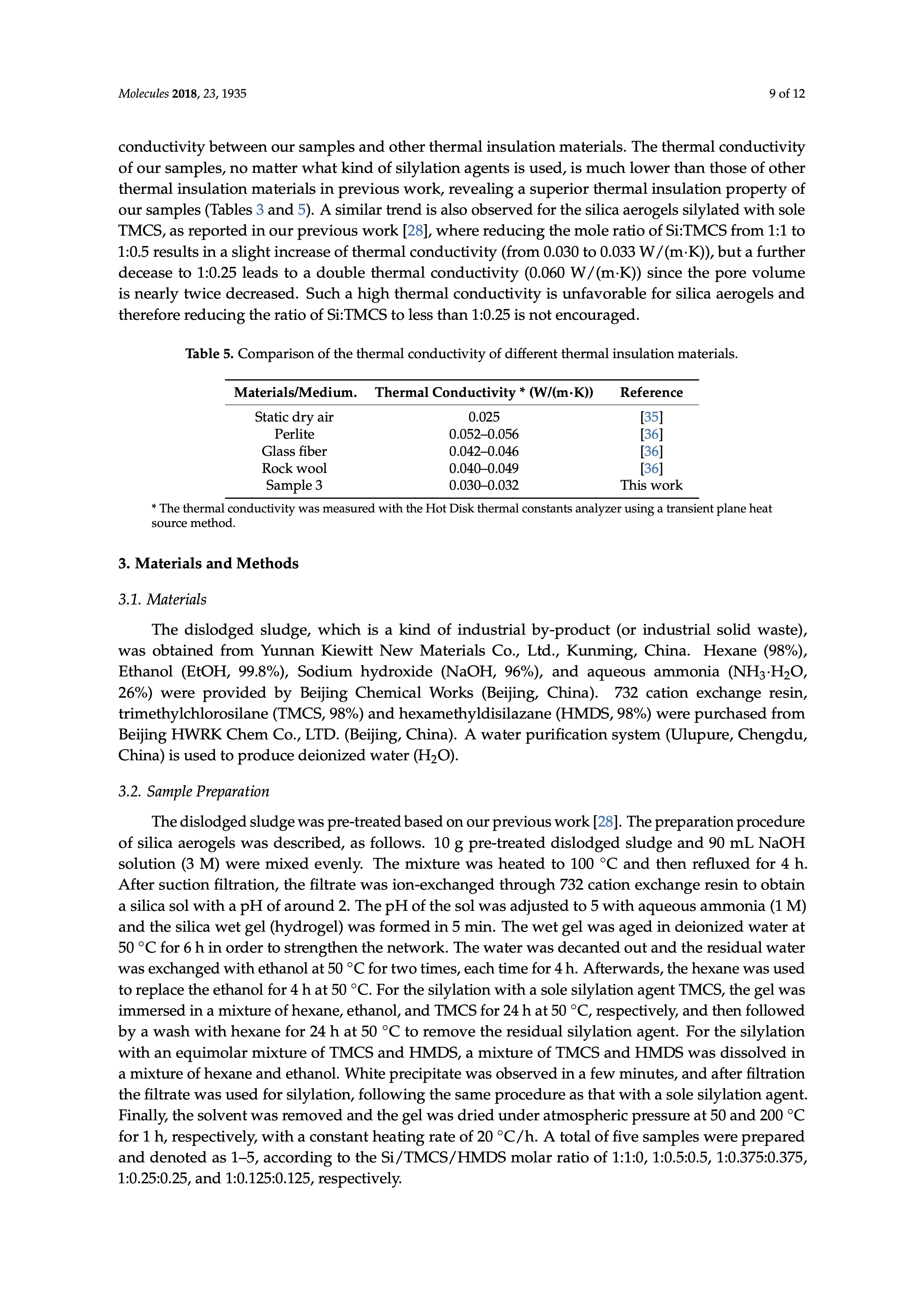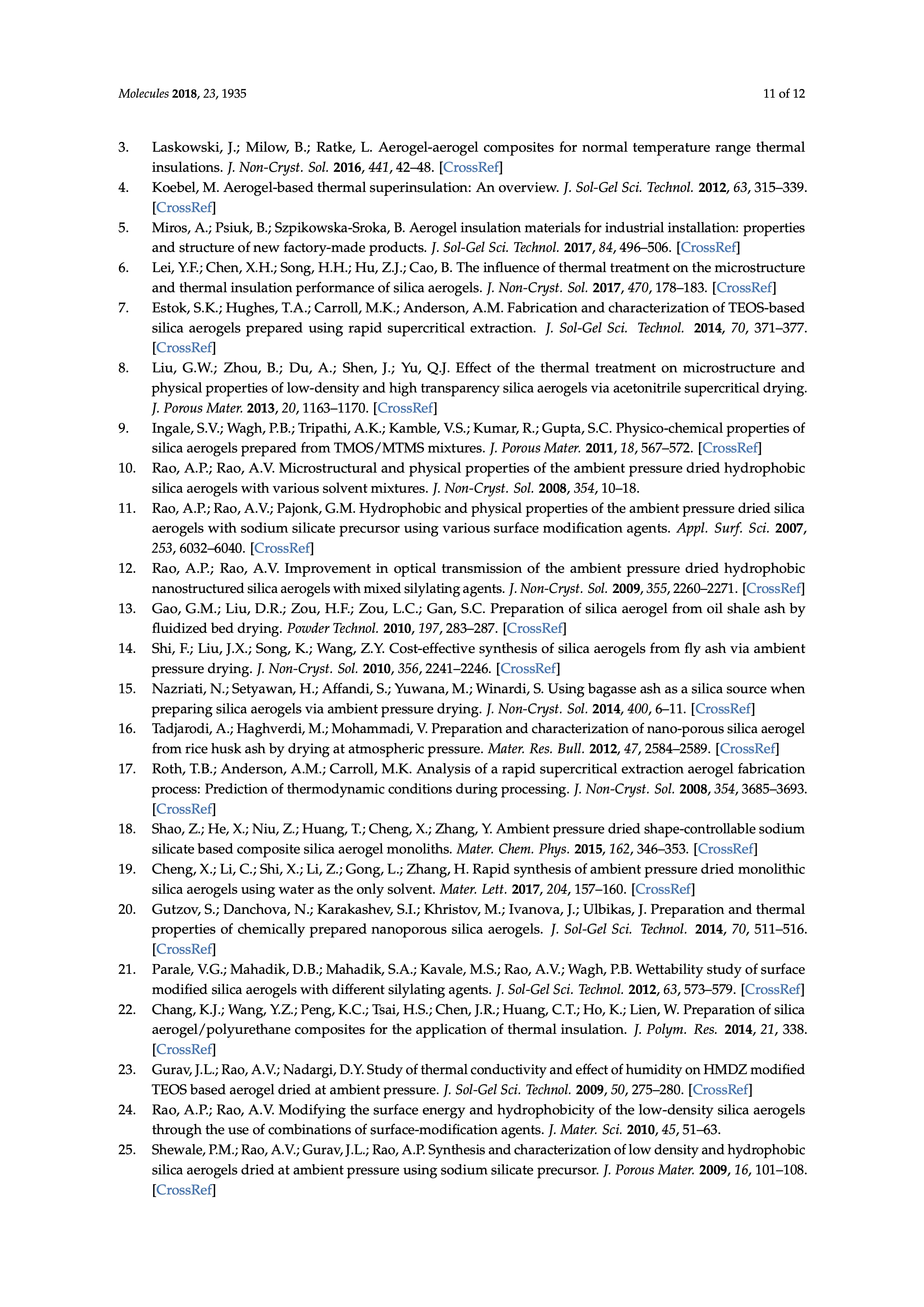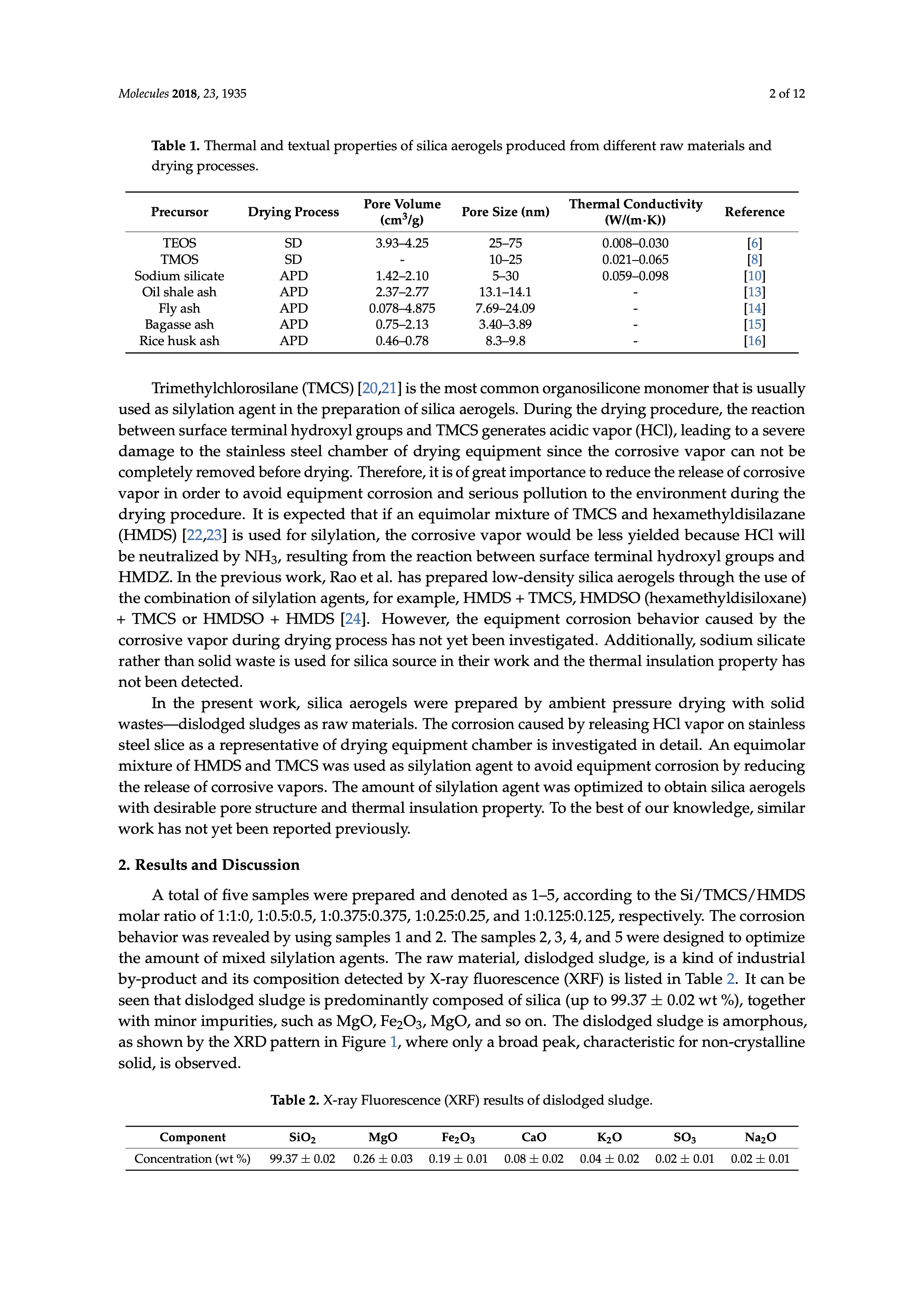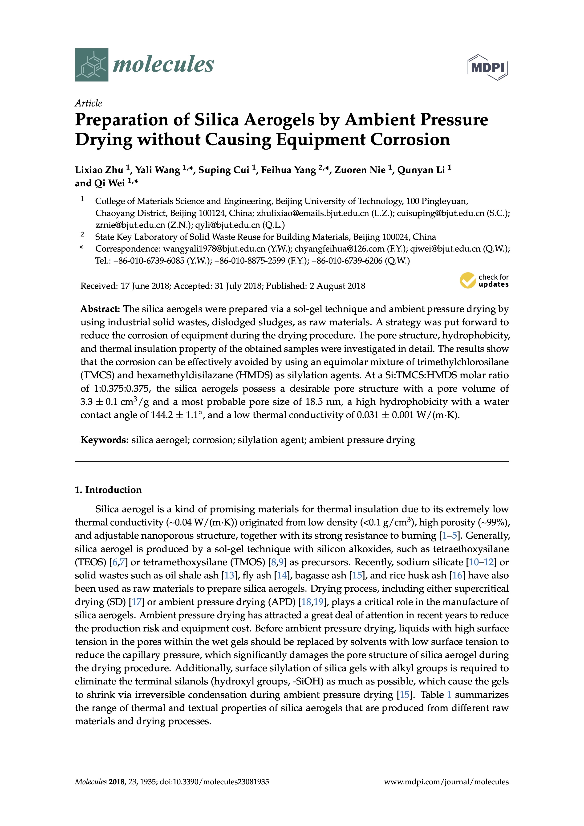 The silica aerogels were prepared via a sol-gel technique and ambient pressure drying by using industrial solid wastes, dislodged sludges, as raw materials. A strategy was put forward to reduce the corrosion of equipment during the drying procedure. The pore structure, hydrophobicity, and thermal insulation property of the obtained samples were investigated in detail. The results show that the corrosion can be effectively avoided by using an equimolar mixture of trimethylchlorosilane (TMCS) and hexamethyldisilazane (HMDS) as silylation agents. At a Si:TMCS:HMDS molar ratio of 1:0.375:0.375, the silica aerogels possess a desirable pore structure with a pore volume of 3.3 ± 0.1 cm3/g and a most probable pore size of 18.5 nm, a high hydrophobicity with a water contact angle of 144.2 ± 1.1◦, and a low thermal conductivity of 0.031 ± 0.001 W/(m·K).