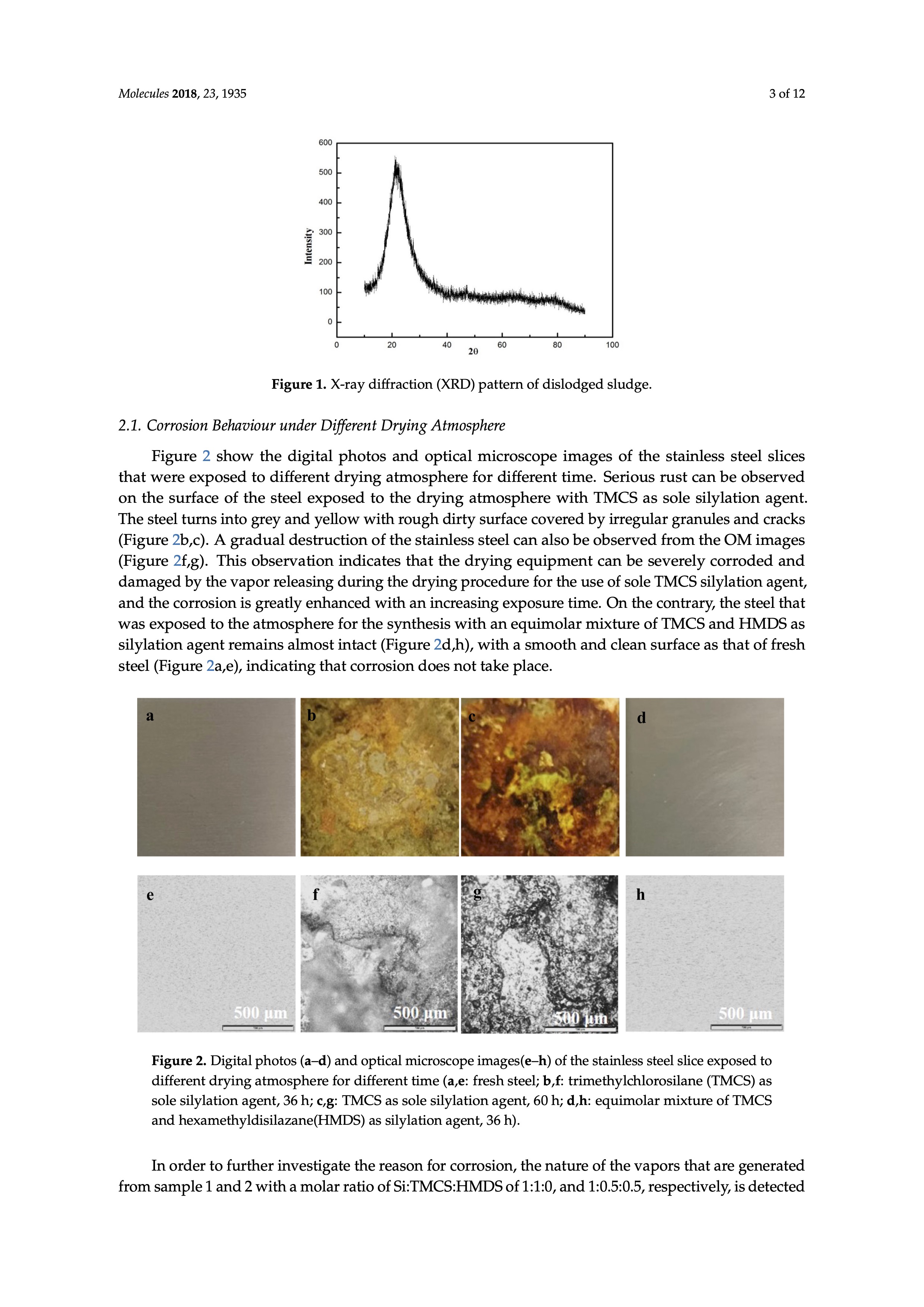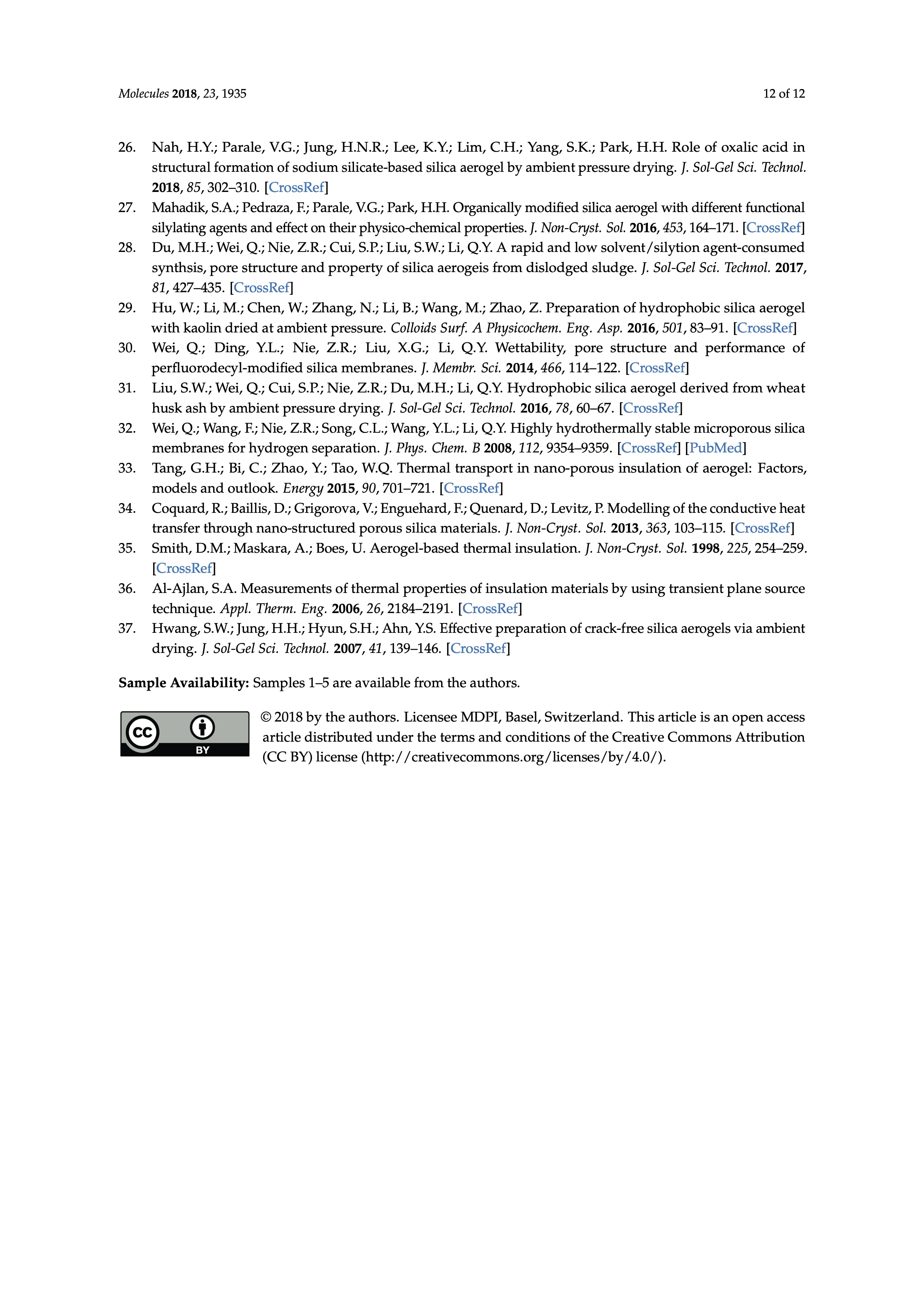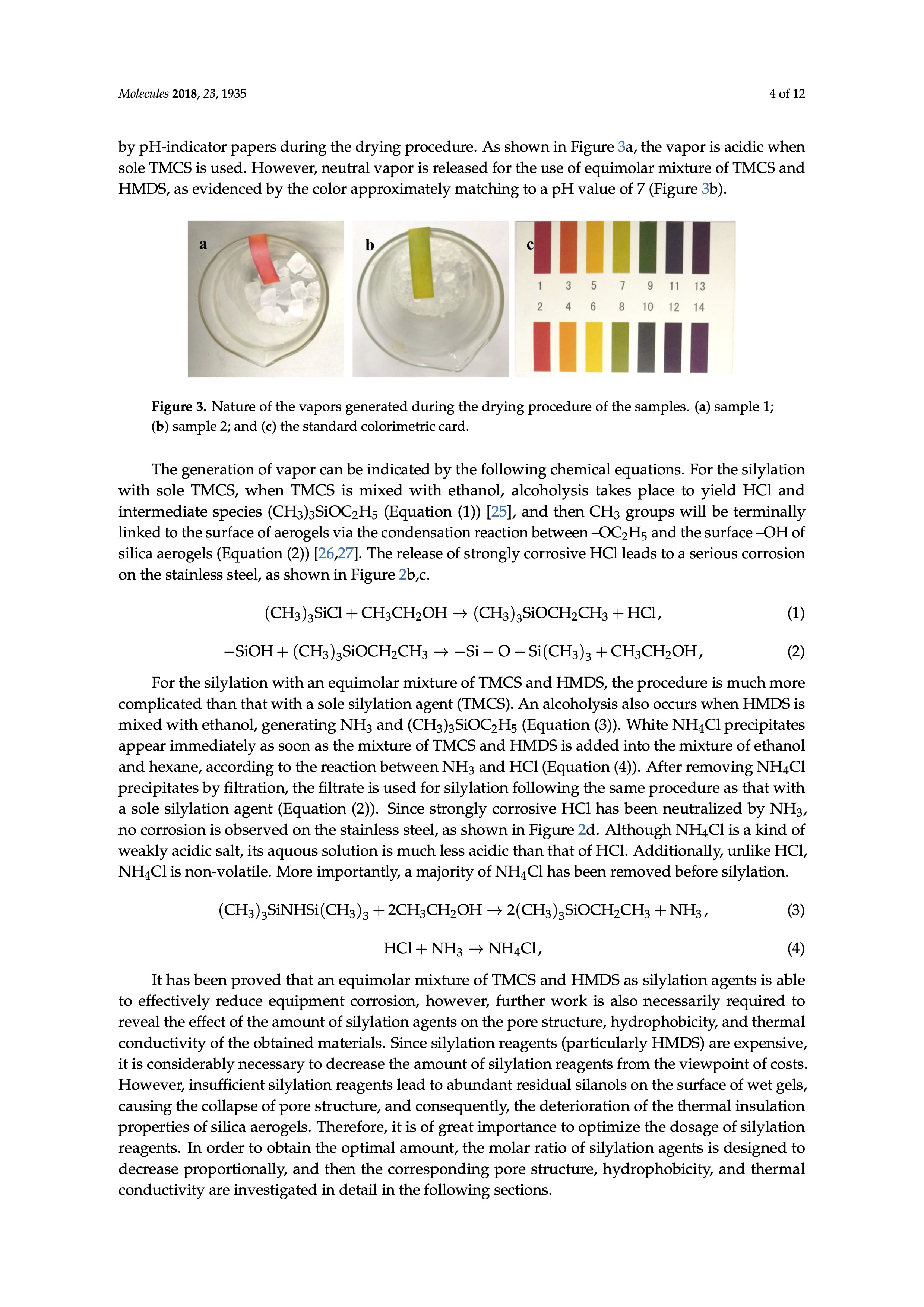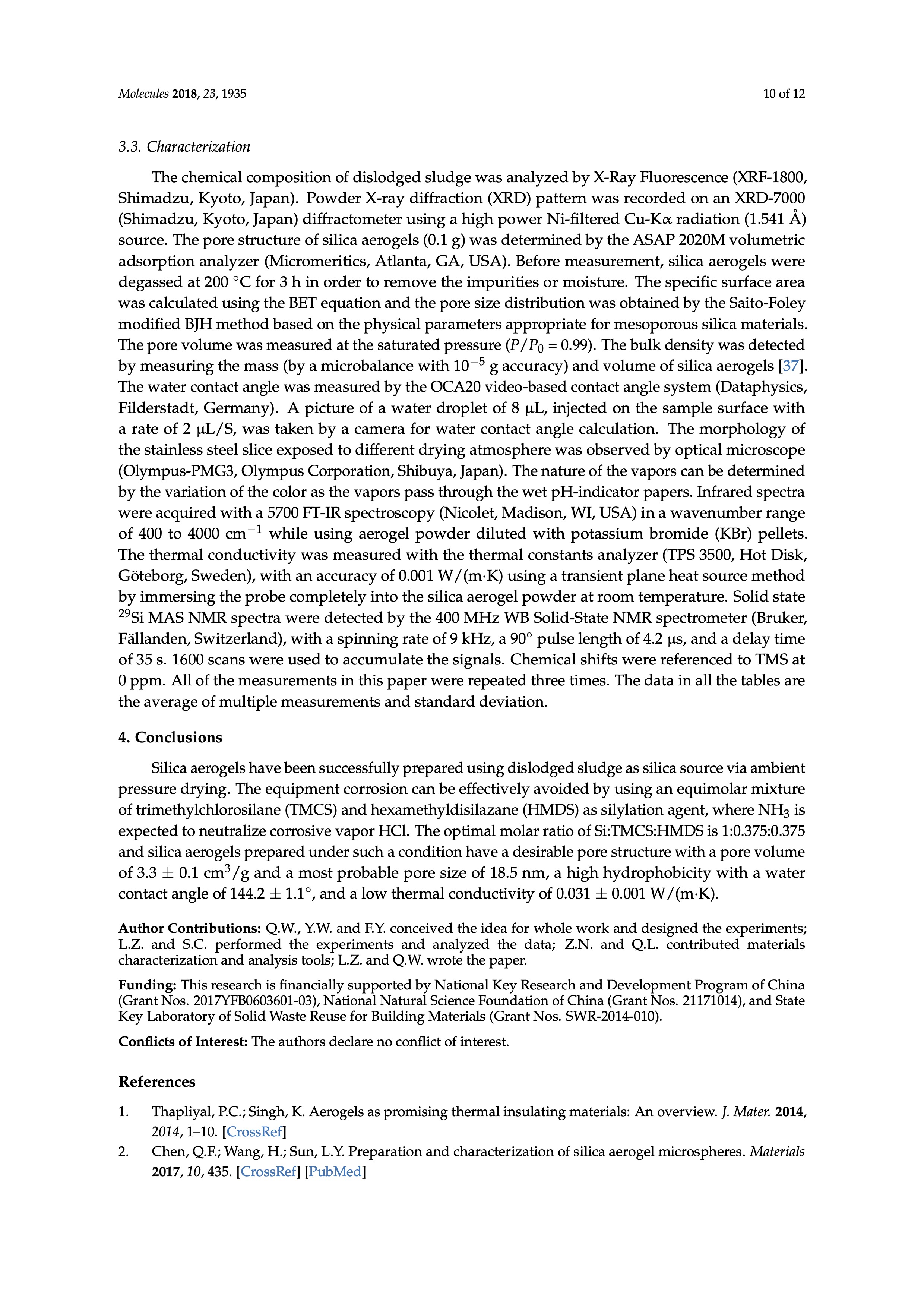 The silica aerogels were prepared via a sol-gel technique and ambient pressure drying by using industrial solid wastes, dislodged sludges, as raw materials. A strategy was put forward to reduce the corrosion of equipment during the drying procedure. The pore structure, hydrophobicity, and thermal insulation property of the obtained samples were investigated in detail. The results show that the corrosion can be effectively avoided by using an equimolar mixture of trimethylchlorosilane (TMCS) and hexamethyldisilazane (HMDS) as silylation agents. At a Si:TMCS:HMDS molar ratio of 1:0.375:0.375, the silica aerogels possess a desirable pore structure with a pore volume of 3.3 ± 0.1 cm3/g and a most probable pore size of 18.5 nm, a high hydrophobicity with a water contact angle of 144.2 ± 1.1◦, and a low thermal conductivity of 0.031 ± 0.001 W/(m·K).